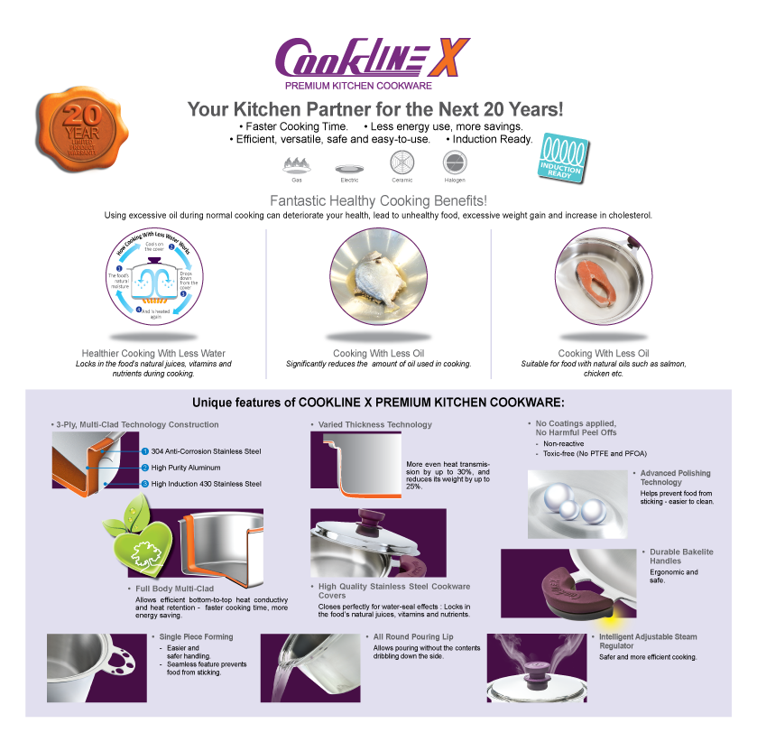 A 3-ply, full body multi-clad construction that comprises 2 layers of high quality stainless steel bonded with an internal high purity Aluminium core brings you outstanding quality cookware that offers unsurpassed performance and exceptional cooking properties - your dependable kitchen partner for the next 20 years!