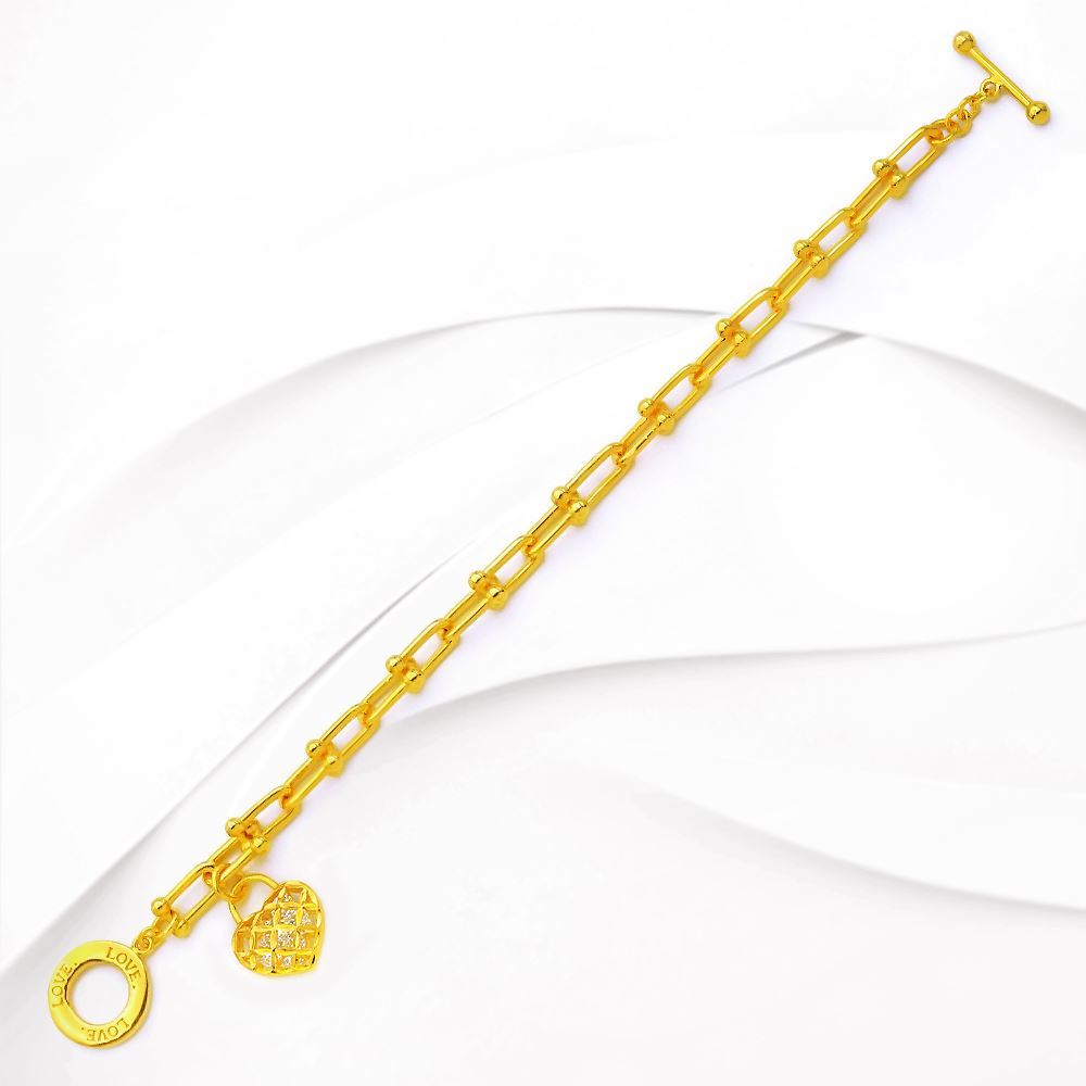 • Adorned with a perforated heart charm filled with 5 sparkling CZ stones and finished with a T-bar and 'LOVE' engraved loop clasp.