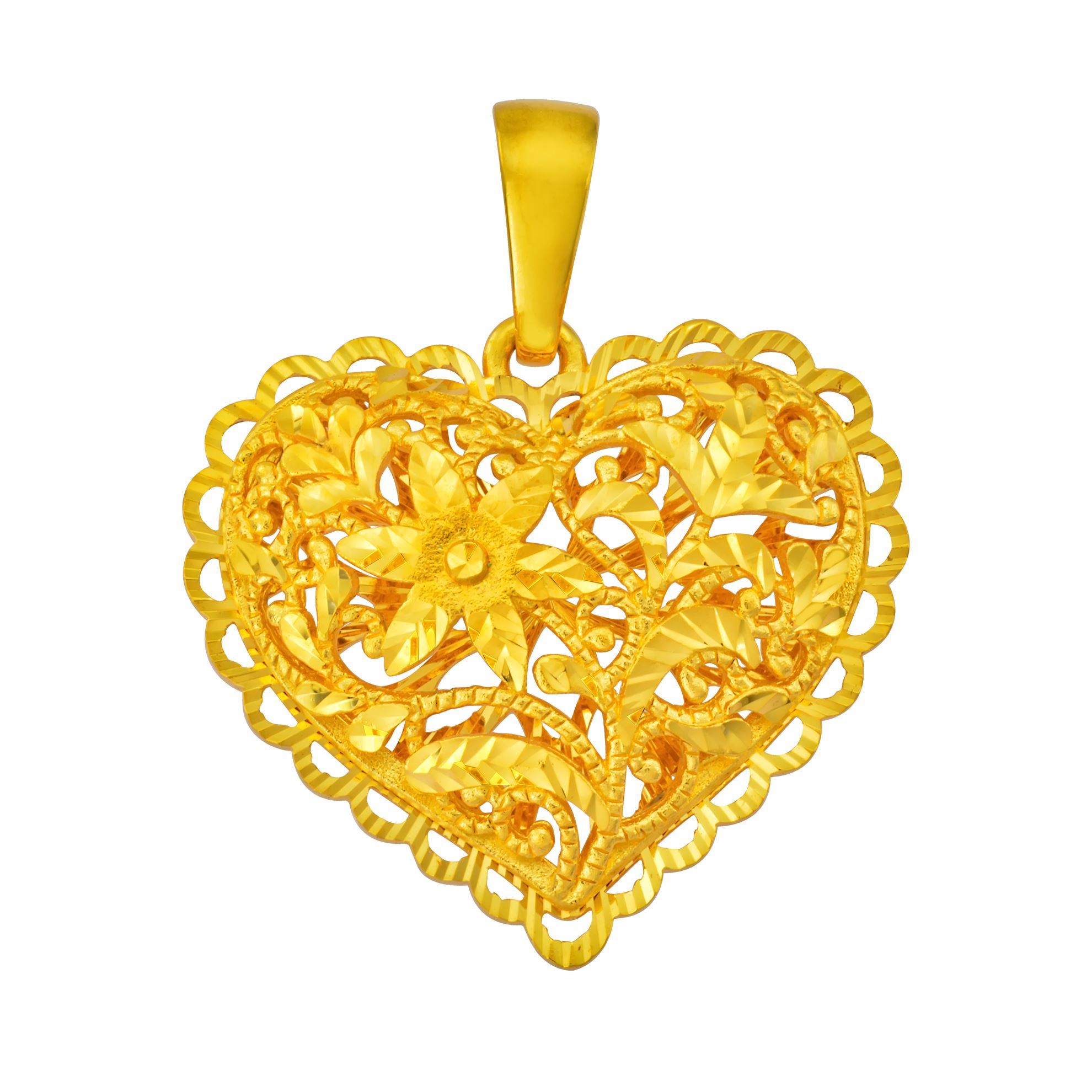 This big pendant comes in the form of a lovely perforated, puffy heart with scallops around it.Â