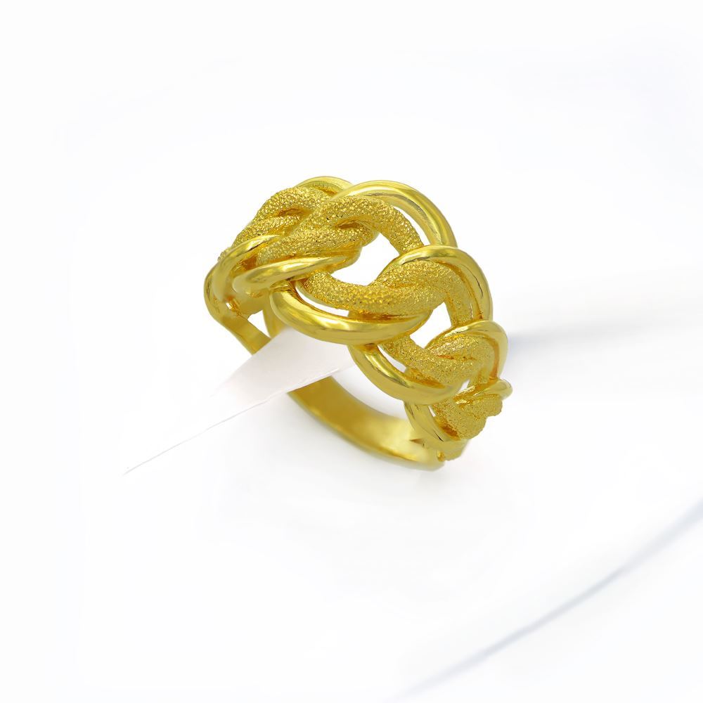 This sparkling band with its interlocking design of smooth finishing and starburst texture make the ring uniquely grand.