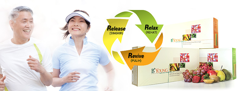 B’YOUNG adalah pakej lengkap produk yang membekalkan kebaikan anti-penuaan yang bersepadu lagi menyeluruh. Menggunakan konsep 3 R (release-singkir, relax-rehat dan revive-pulih), rangkaian produk ini menawarkan kebaikan kesihatan untuk jangkamasa pendek dan panjang seperti meningkatkan fungsi organ, melindungi dari penyakit kronik utama, memberikan kesihatan penglihatan dan mental, melegakan stres, mengekalkan kesihatan gastrousus dan mencuci tubuh, menguatkan pertahanan anti-oksidan dan fungsi imun. Pengambilan B’YOUNG yang kerap secara berdisiplin memberikan peluang kepada kita untuk mengekalkan keremajaan lebih lama selain melambatkan tercetusnya penyakit degeneratif.