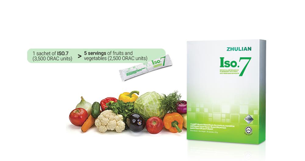 - Each sachet of ISO.7 supplies approximately 3,500 mole TE/g or ORAC value of antioxidants to curb harmful effects of free radicals,