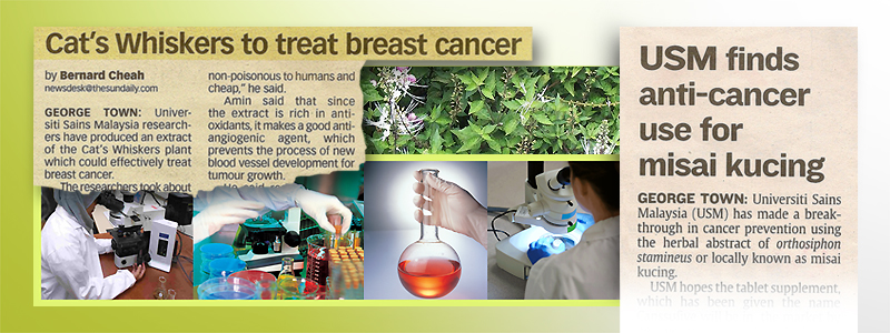 Most recently, a group of researchers from Universiti Sains Malaysia has shown that Misai Kucing extract has a potential application in the treatment of cancer (news clippings, The Star and The Sun, 22 October 2009). The extract produced from the herb contains high antioxidant properties which have the ability to retard the further growth of blood vessels around the tumour cells. The growth of tumour cells depend completely on a supply of oxygen and food received from the blood stream. When cancer cells grow, they stimulate the growth of new blood vessels, and this is also how the cancer cells spread to other tissues and organs. This discovery is exciting particularly to the breast cancer patients who are currently on chemotheraphy treatments.
