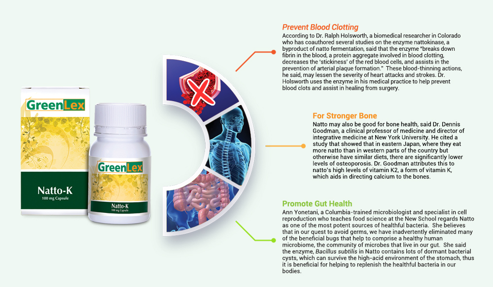 A folk remedy for heart and vascular diseases used in Japan for over 1000 years is now available in the form of convenient capsules.  GREENLEX NATTO-K is formulated by carefully selected organic and non-GMO soybeans which were fermented using fermentation process of modern biotechnology with patented strain of Bacillus subtilis natto which produces natto, an enzyme with fibrinolytic activity that provides nutritive support for healthy circulation and normal vascular function.