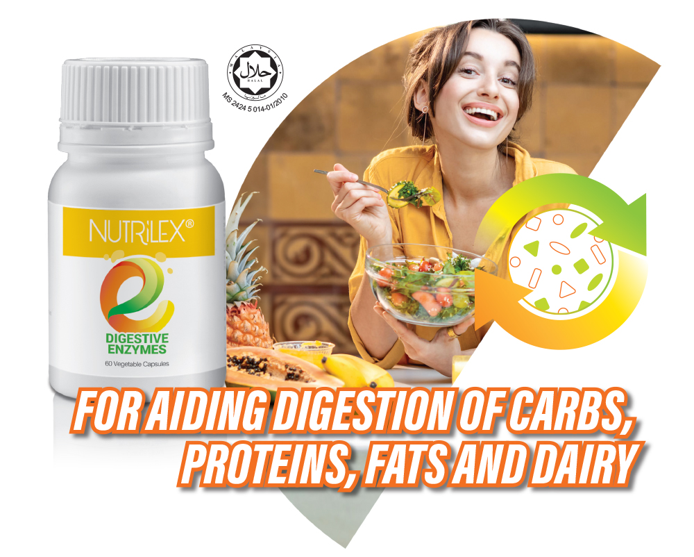 NUTRiLEX Digestive Enzymes is a supplement that contains Bromelain (enzyme derived from pineapple), Papain (enzyme derived from papaya) with Amylase, Protease, Lactase, Cellulase and Lipase which are microbial enzymes produced via fermentation method.