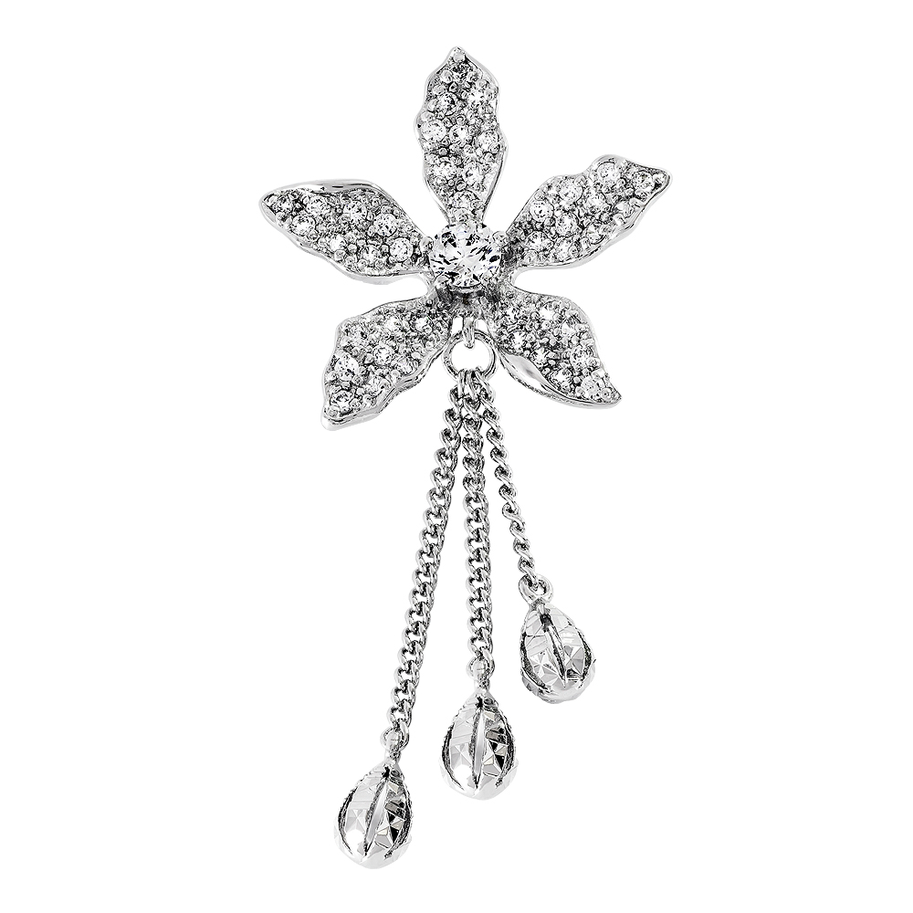This brooch has numerous amount of clear, cubic zirconias beautifully scattered on it, complemented with 3 dangling chains with a bauble at each end.