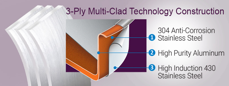 Unique 3-ply construction combines a high-induction stainless steel exterior, a pure aluminum core that provides even heat distribution, and a stainless steel interior cooking surface for optimal performance, yielding supremely even heating in a timeless, elegant look to take your cooking to the next level.