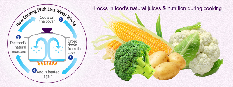 When you rinse the food and put it in the cookware, there will be enough remaining drops of water to produce steam. This small amount of water in addition to the natural juices is enough to ensure that the food is properly cooked. As long as you keep the pot or pan covered, your food can be cooked without the use of additional water.