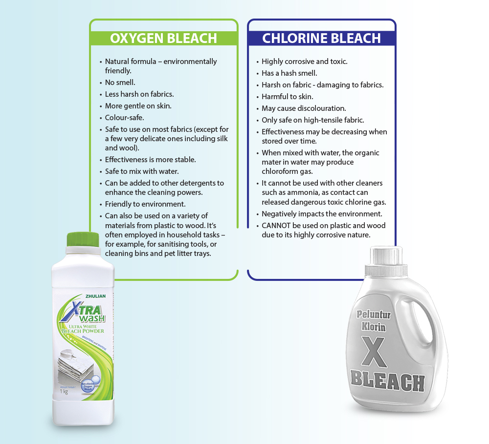 Both bleaches work by oxidising stains and microbes, allowing them to be broken up and lifted away from fabrics and surfaces. Both have excellent whitening and stain-removal power on white fabrics and have anti-microbial qualities that make them good for disinfecting laundry and surfaces. However, they are different in certain way. Let’s see the comparison between OXYGEN BLEACH & CHLORINE BLEACH: